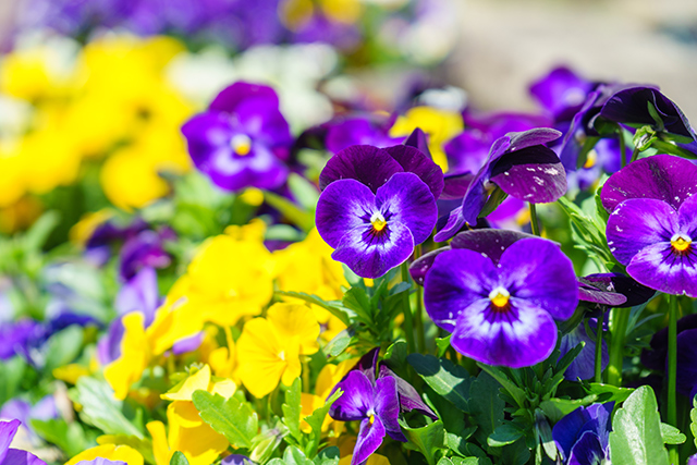 Pansies have small blossoms, and they usually come in hues of blue, purple, and yellow. The flowers have five overlapping petals with a dark area in the center that looks like an ink stain.