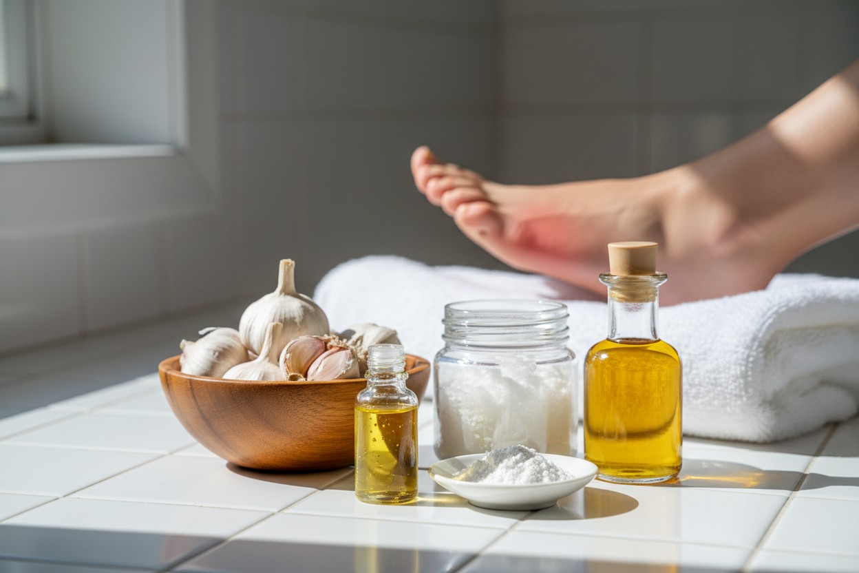 Other commonly recommended items include garlic, which shows broad-spectrum antifungal activity, coconut oil for its antimicrobial properties, baking soda for its alkaline nature, and Epsom salt for use in foot soaks. [7] [8] [9] A report compiled findings that ingredients like salt and natural oils can interrupt fungal life cycles. [10] Proponents suggest these remedies offer practical steps that do not rely on pharmaceutical products. [10]